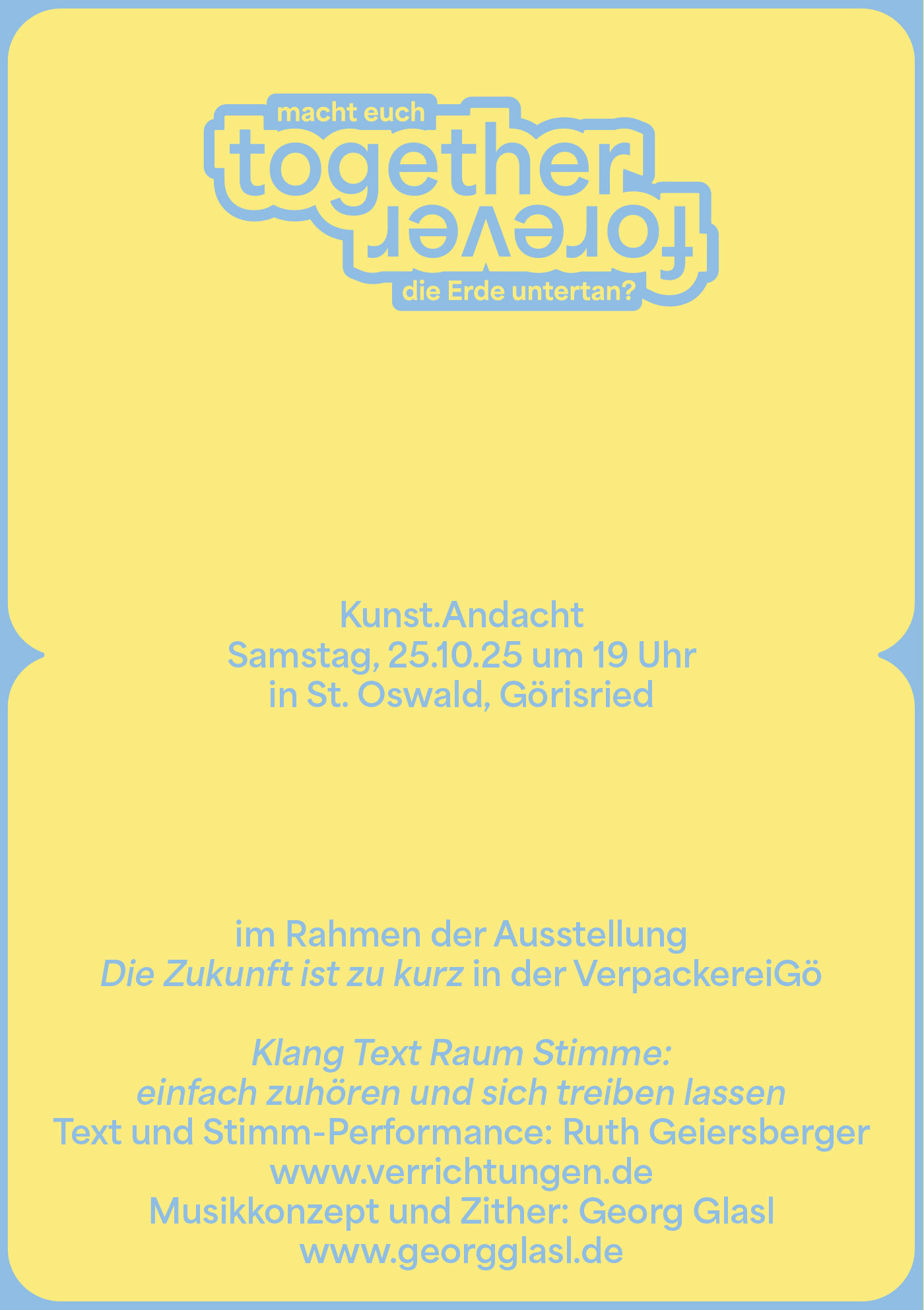 Zurück together forever 2025 Künstler*innen: Elke Dreier Johannes Kiel Christof Rehm Judith Neunhäuserer Lea Grebe Martin Schmidt Max Schmelcher & Kurt Holzkämper Rosanna Maria Pondorf Georg Thumbach